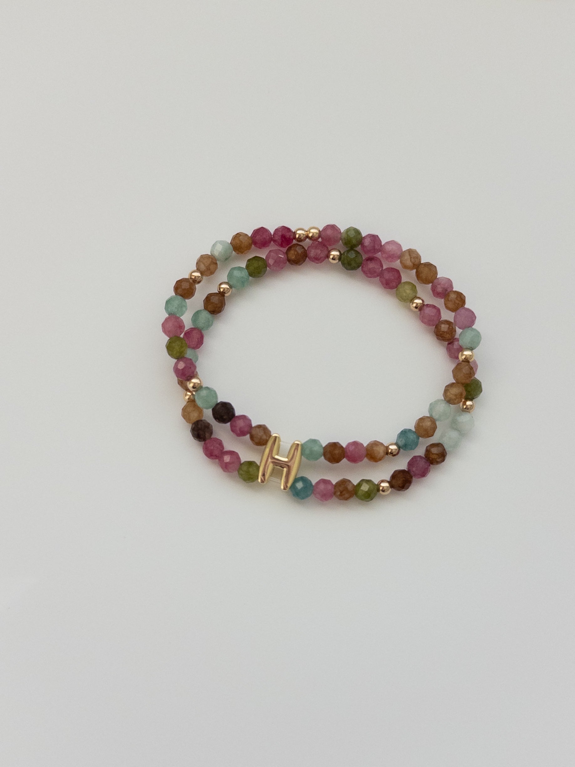 Made with 4mm faceted jade beads and strung on a pre-stretched cord. This bracelet is double banded with one 18k gold filled bubble letter bead.Please leave the letter of your choice in the comment box. Gold filled beads will not tarnish in water or sweat. Each bracelet is handmade to order.